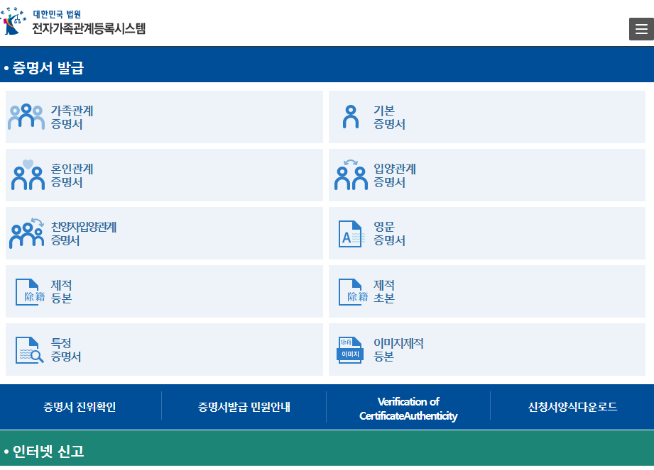 - 공식 홈페이지 접속: 검색창에 '가족관계증명서'를 입력하거나 위 공식 링크로 접속합니다.